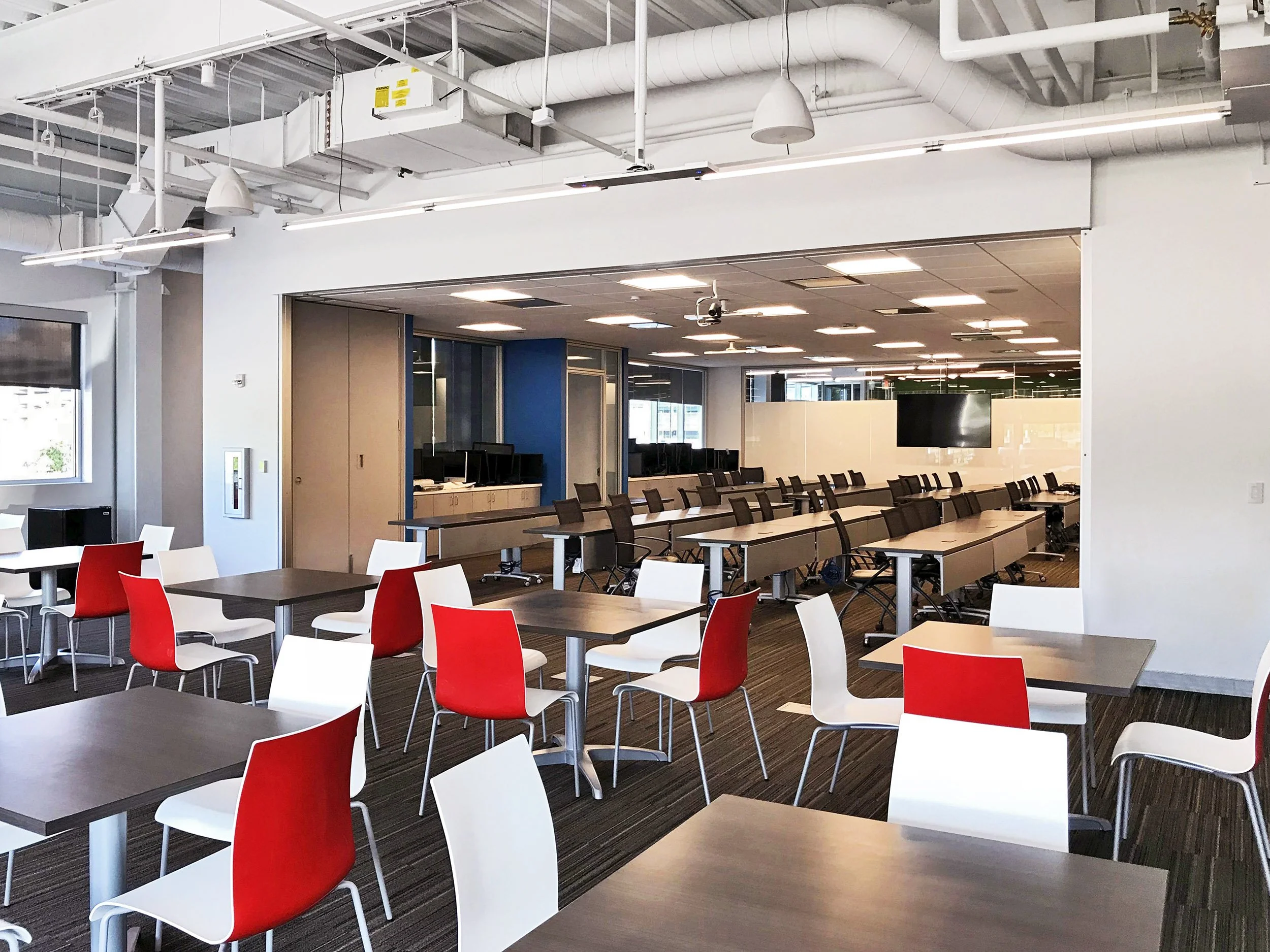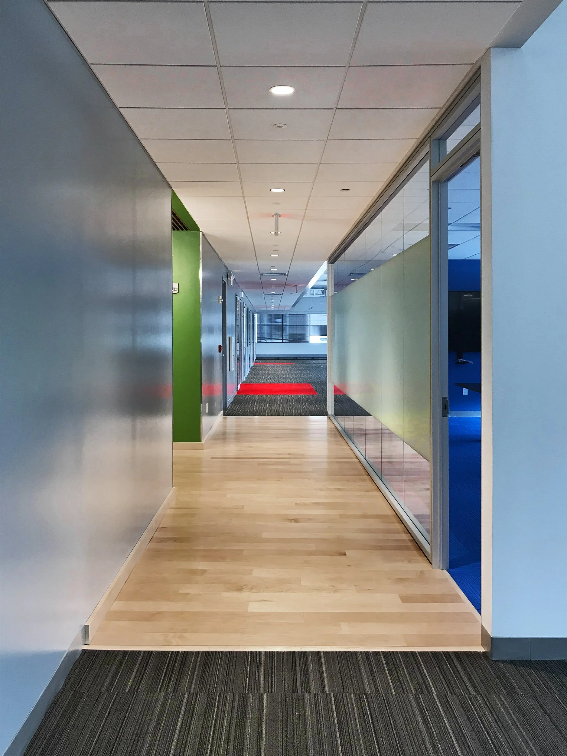 The work space prioritizes productivity via flexibility, stand up desks, ergonomic chairs, well defined walkways large enough to give space for employee interaction, and defined breakout spaces. The space is designed as an agile interiors where all furniture is on wheels or easily moved by occupants. All furniture is highly efficient and movable to both allow for flexibility and for an extremely efficient work place resulting in approximately 80 gsf per occupant.