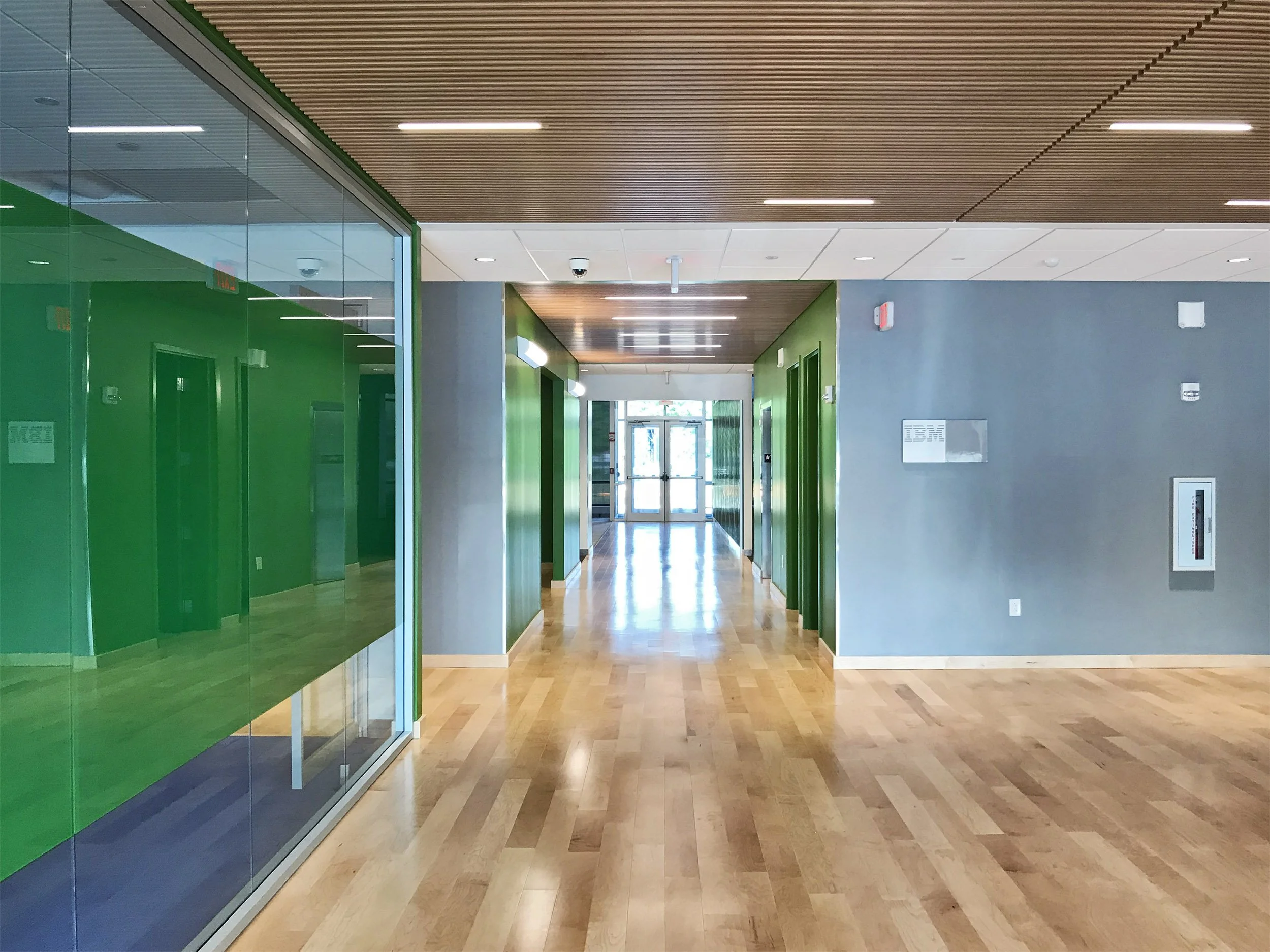 The interiors at IBM are designed to reflect the city of Cleveland grid, creating cross streets out of clearly defined walkways that organize the flexible and movable work spaces. The walkways are also positioned within the building to draw one’s eye out the windows to the city beyond, further enforcing the sense of the city grid being drawn into the building, and ultimately connecting the project to the city center and the lake.