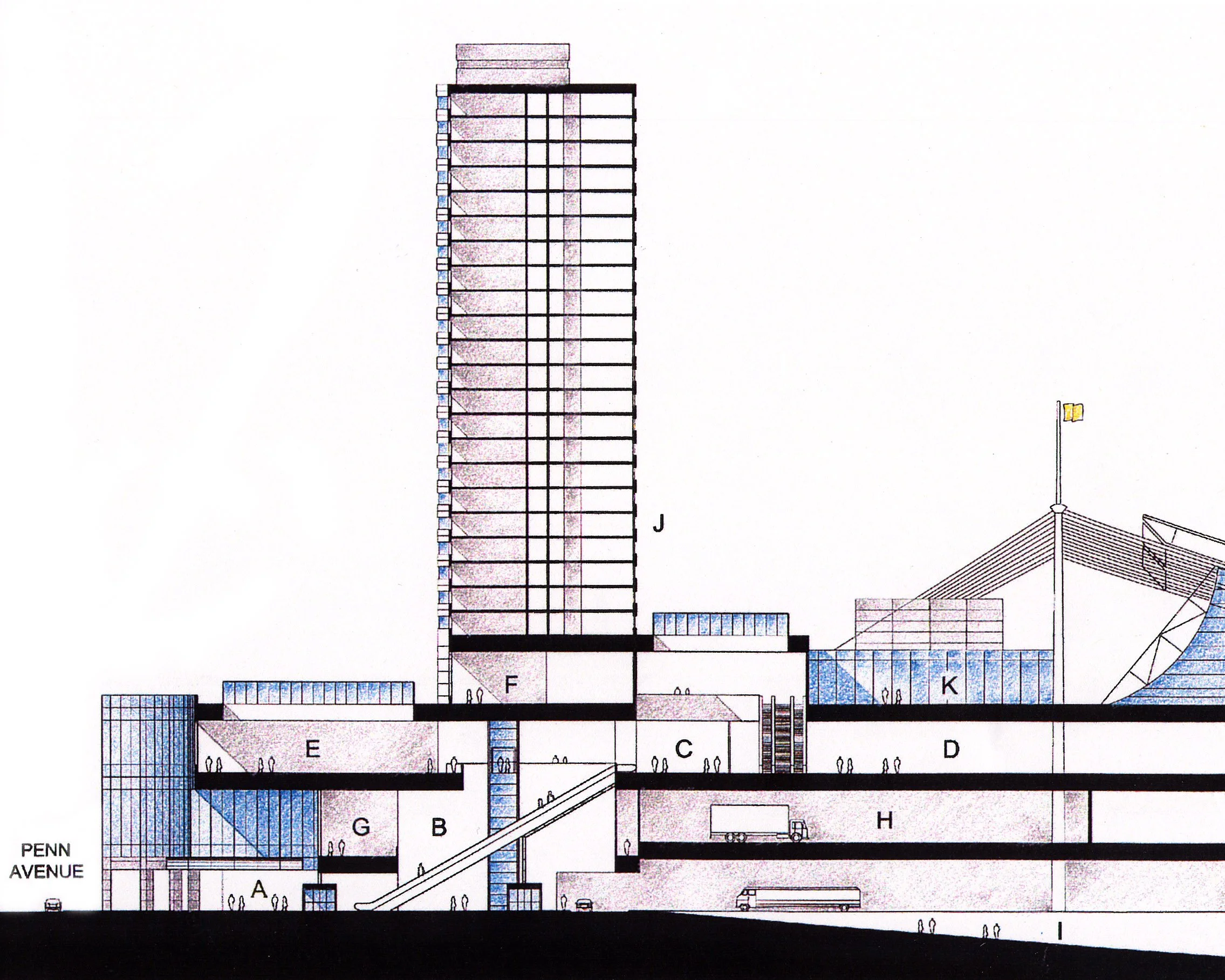 The Hyatt Hotel design integrates the view corridors and urban plazas created by Rafael Vinoly and respects architectural language of the Convention Center. The Hyatt concept both supports the urban scale of Penn Avenue and stands as recognizable, distinctive, hotel architecture.