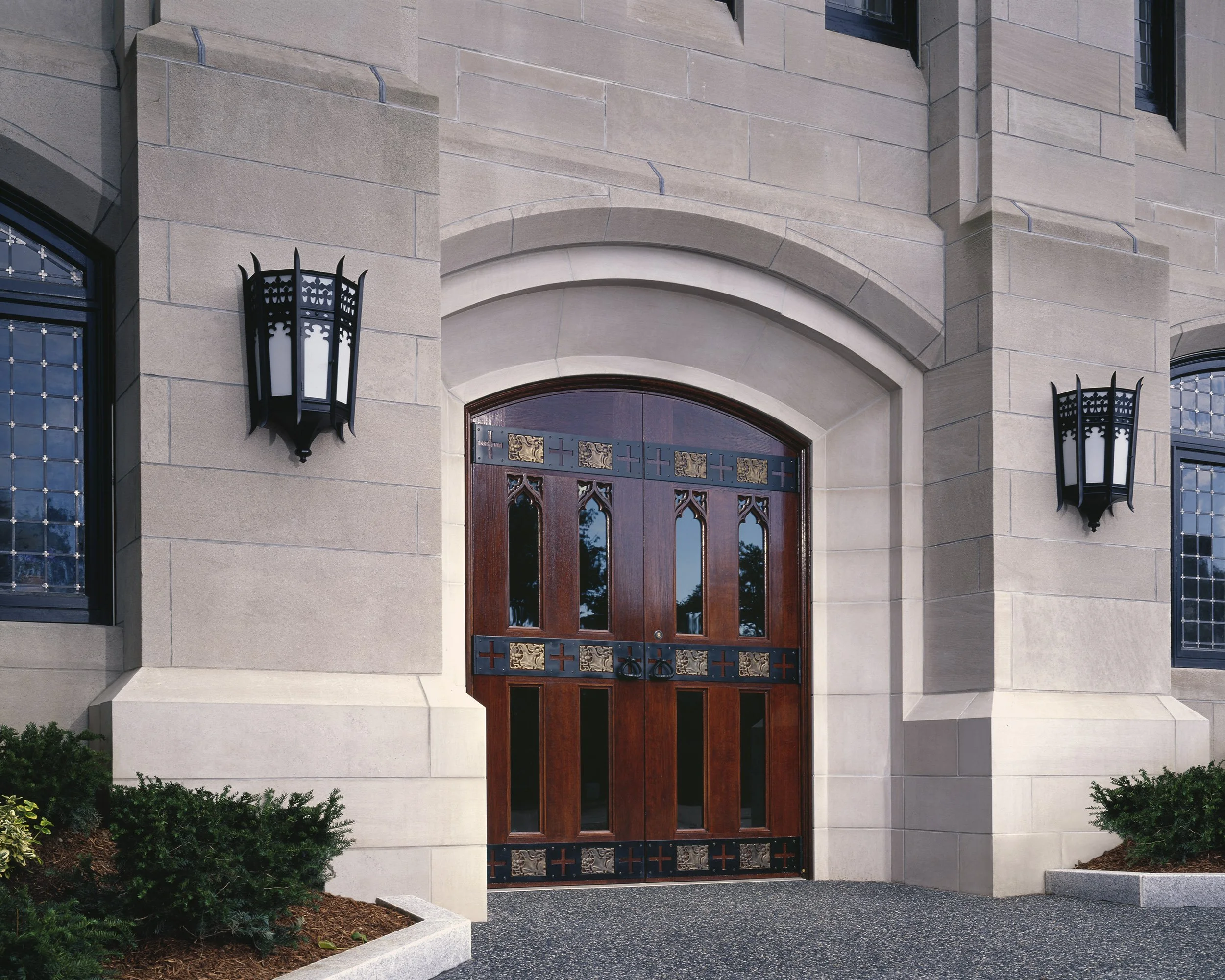Church amenities such as the new elevator, the new grand staircase, accessible restroom facilities and a bookstore are in clear view of the visitor. To accommodate the new staircase, the original tri-window bay was relocated. Historically appropriate leaded glass windows were added to the new main level façade, and a pair of new oak doors with iron strap hinges were replicated from the existing Refectory to define the new entrance.